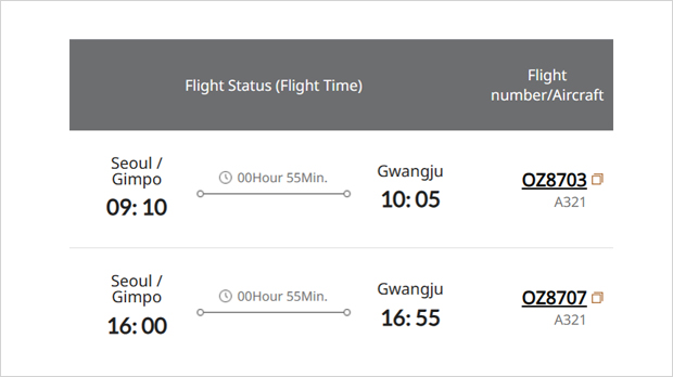 Flight: Asiana Airlines (OZ8707) from Seoul/Gimpo to Gwangju at 16:00 16:55 on November 8th, 2024.